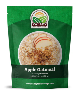 Valley Food Storage Apple Oatmeal features the crisp, sweet taste of apples and can be used as a healthy and delicious snack or as a dish all on its own, making it perfect for a quick and convenient breakfast or lunch for the whole family. Each pouch of apple oatmeal contains 10 servings.